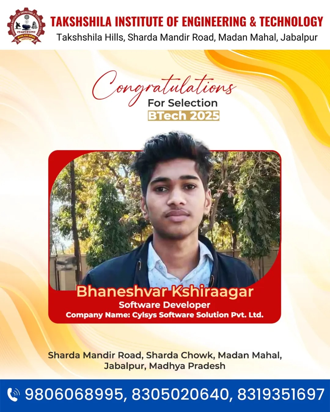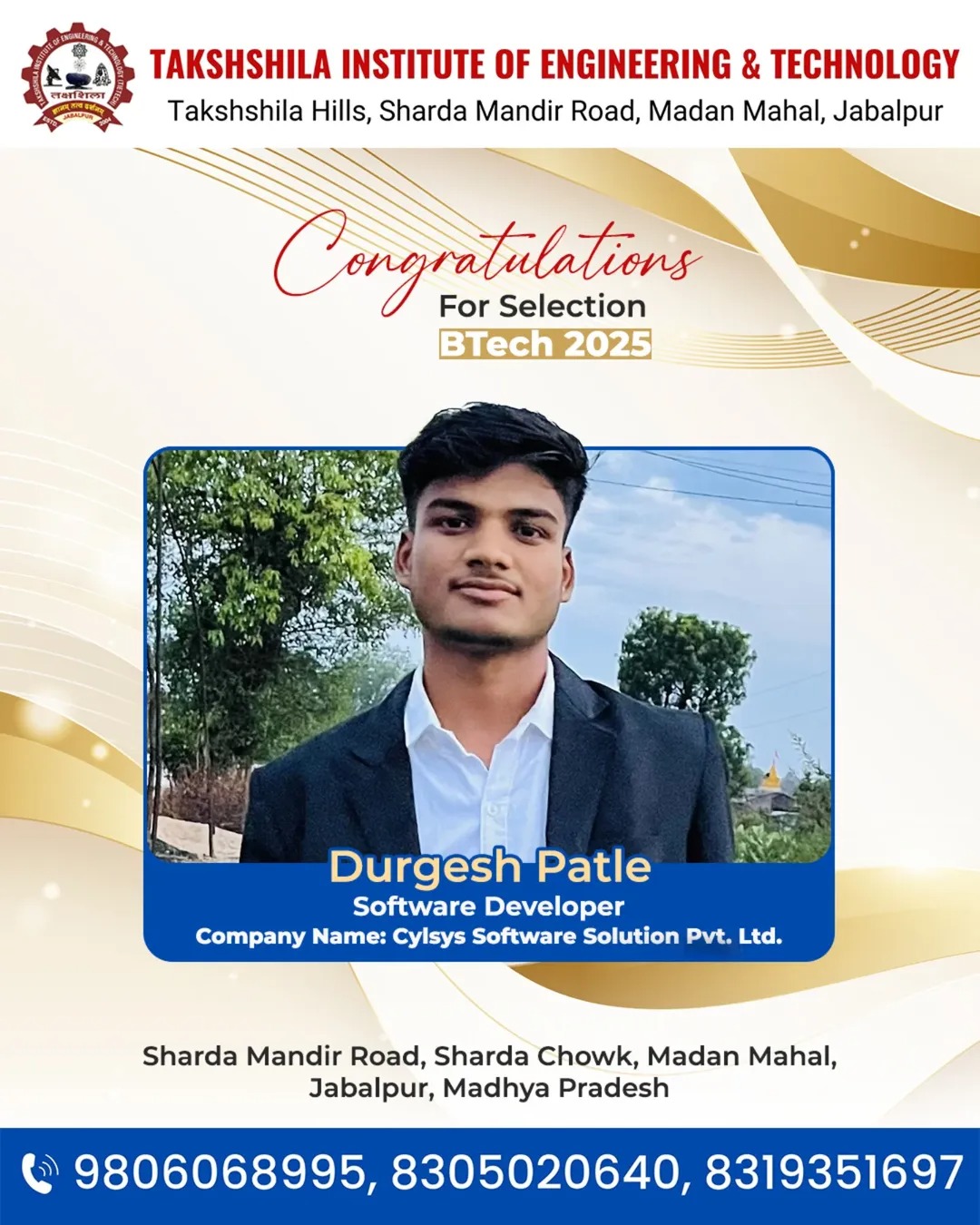 | VIKAS KUMAR SINGORE(BE-EC) GRAPHENE SEMICONDUCTOR | PRIYANSHU SAHU(BE-CS) CHAPTER 247 | PAWAN GUPTA(BE-EC) DANLAW TECHNOLOGY | RAMAKANT JAISWAL(BE-CS) GENESIS TECHNOLOGIES | Md. SHAHIK NAWAZE (BE-CS) GENESIS TECHNOLOGIES | |